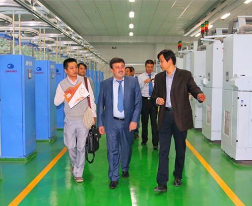 2014年9月18日,塔吉克斯坦總理特使蘇合拉特一行來咸陽紡織集團(tuán)拜訪。圖為蘇合拉特一行參觀了集團(tuán)公司一分廠紡紗生產(chǎn)線。