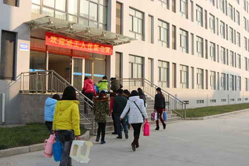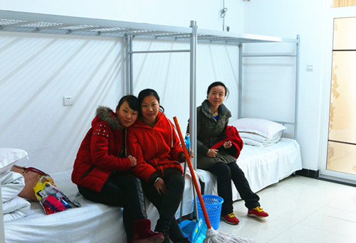 2014年12月23日上午,咸陽紡織集團一分廠職工正式搬遷入住集團“職工公寓”。 公寓大樓建筑面積約18000平方米,共8層(配有電梯),每層都設(shè)有洗衣房、活動室、電視室。宿舍294間套內(nèi)面積34平方米,安排4人入住,可容納1176名職工,每間宿舍內(nèi)衣柜、網(wǎng)絡(luò)接口、衛(wèi)生間、淋浴、空調(diào)、寫字臺等配套設(shè)施一應(yīng)俱全,足不出戶就能看電視、上網(wǎng)和洗澡,使職工真正享受到冬暖夏涼的“家庭式”待遇。 “歡迎職工入住新公寓”的橫幅懸掛在公寓入口處,在派發(fā)鑰匙現(xiàn)場,幸福的笑容在職工們臉上綻放,大家對住宿環(huán)境的優(yōu)美和配套設(shè)施的便利贊不絕口,一位職工激動地說道:“公寓環(huán)境真不錯!住的好,干的也踏實!”